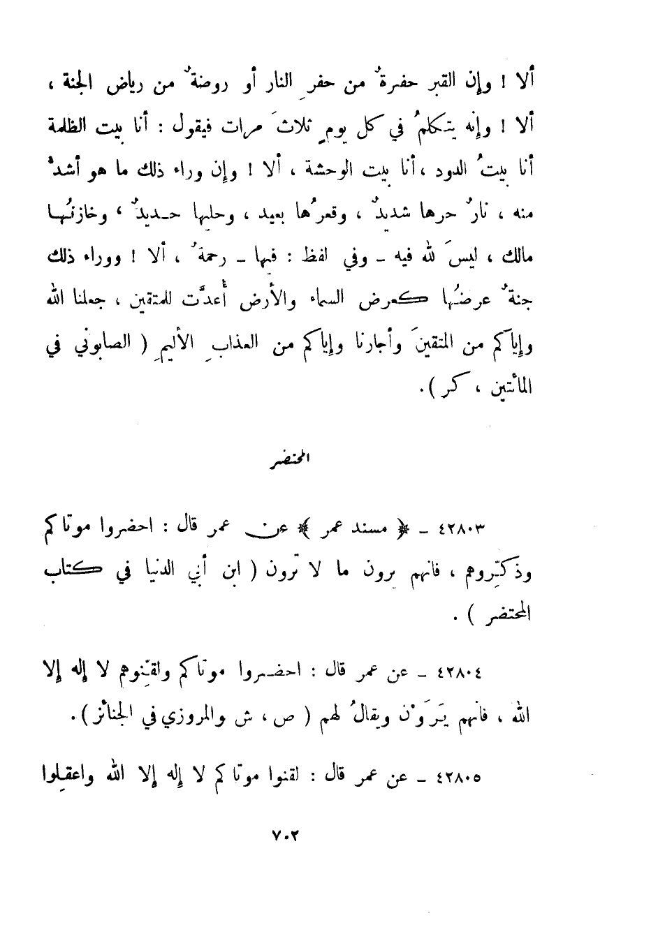 42804- عن عمر قال: احضروا موتاكم ولقنوهم لا إله إلا الله، فإنهم يرون ويقال لهم."ص، ش والمروزي في الجنائز".