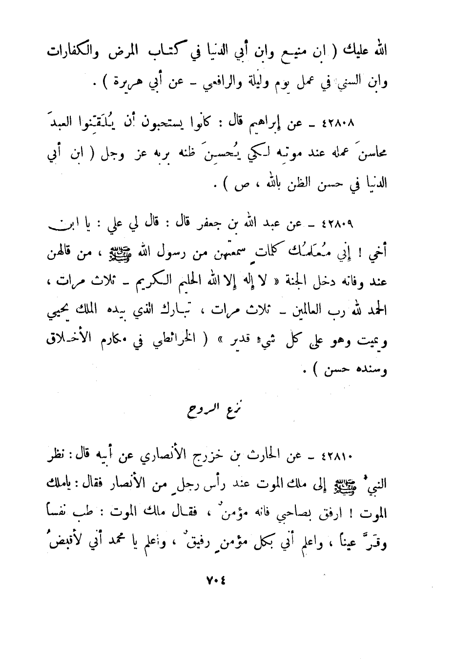 42809- عن عبد الله بن جعفر قال: قال لي علي: يا ابن أخي! إني معلمك كلمات سمعتهن من رسول الله صلى الله عليه وسلم، من قالهن عند وفاته دخل الجنة "لا إله إلا الله الحليم الكريم - ثلاث مرات، الحمد لله رب العالمين - ثلاث مرات، تبارك الذي بيده الملك يحيي ويميت وهو على كل شيء قدير"."الخرائطي في مكارم الأخلاق وسنده حسن".