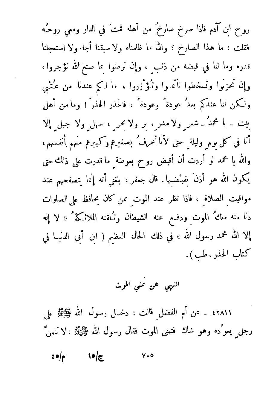 42811- عن أم الفضل قالت: دخل رسول الله صلى الله عليه وسلم على رجل يعوده وهو شاك فتمنى الموت فقال رسول الله صلى الله عليه وسلم: لا تتمن