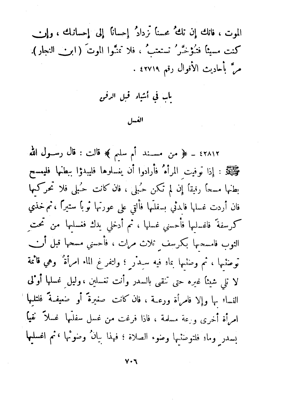 42812- من مسند أم سليم قالت: قال رسول الله صلى الله عليه وسلم: إذا توفيت المرأة فأرادوا أن يغسلوها فليبدؤا ببطنها فليمسح بطنها مسحا رقيقا إن لم تكن حبلى، فإن كانت حبلى فلا تحركيها فإن أردت غسلها فابدئي بسفلتها فألقي على عورتها ثوبا ستيرا، ثم خذي كرسفة فاغسليها فأحسني غسلها، ثم أدخلي يدك فغسليها من تحت الثوب فامسحيها بكرسف ثلاث مرات، فأحسني مسحها قبل أن توضئيها، ثم وضئيها بماء فيه سدر؛ ولتفرغ الماء امرأة وهي قائمة لا تلي شيئا غيره حتى تنقى بالسدر وأنت تغسلين، وليل غسلها أولى النساء بها وإلا فامرأة ورعة، فإن كانت صغيرة أو ضعيفة فلتلها امرأة أخرى ورعة مسلمة، فإذا فرغت من غسل سفلتها غسلا نقيا بسدر وماء فلتوضئيها وضوء الصلاة؛ فهذا بيان وضوئها، ثم اغسليها
