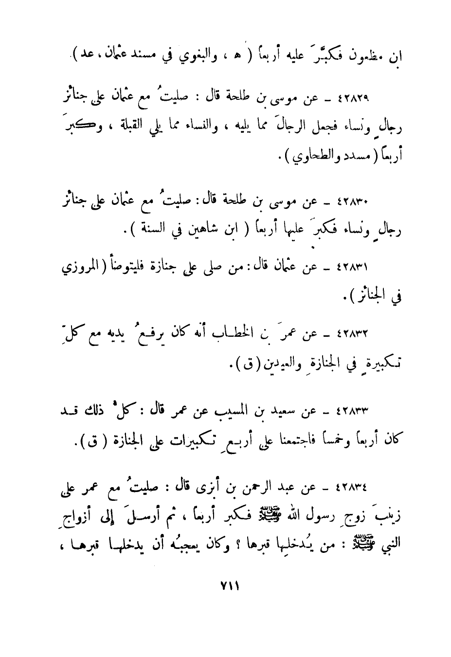 42830- عن موسى بن طلحة قال: صليت مع عثمان على جنائز رجال ونساء فكبر عليها أربعا."ابن شاهين في السنة".