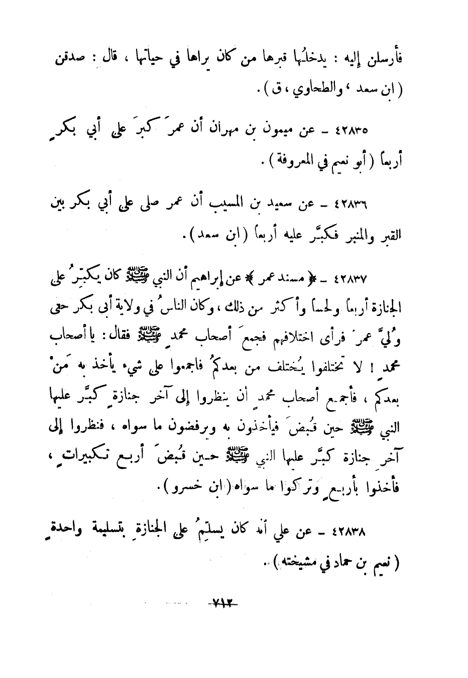 42836- عن سعيد بن المسيب أن عمر صلى على أبي بكر بين القبر والمنبر فكبر عليه أربعا."ابن سعد".