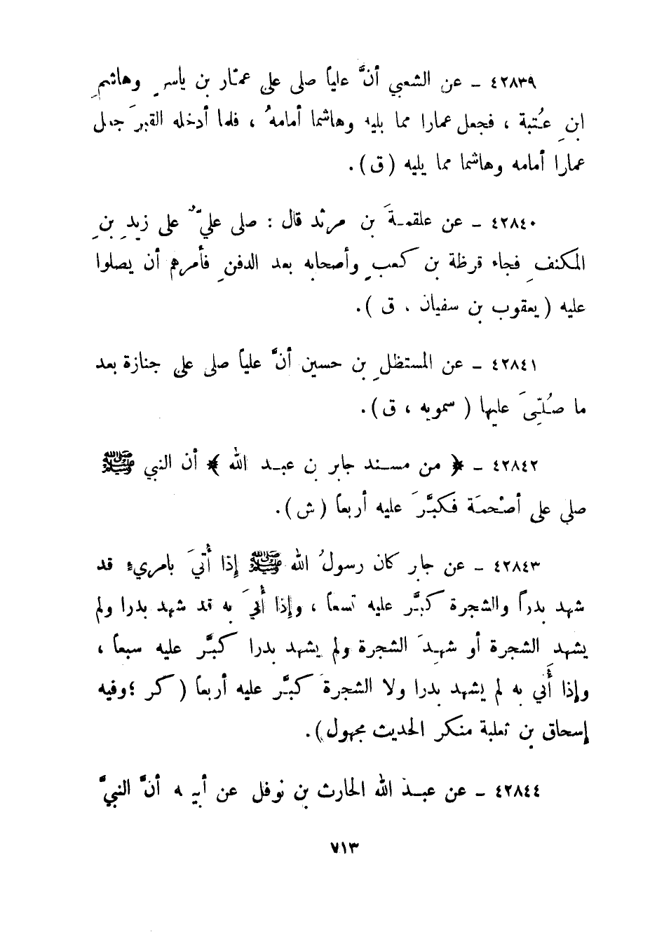 42839- عن الشعبي أن عليا صلى على عمار بن ياسر وهاشم ابن عتبة، فجعل عمارا مما يليه وهاشما أمامه، فلما أدخله القبر جعل عمارا أمامه وهاشما مما يليه."ق".