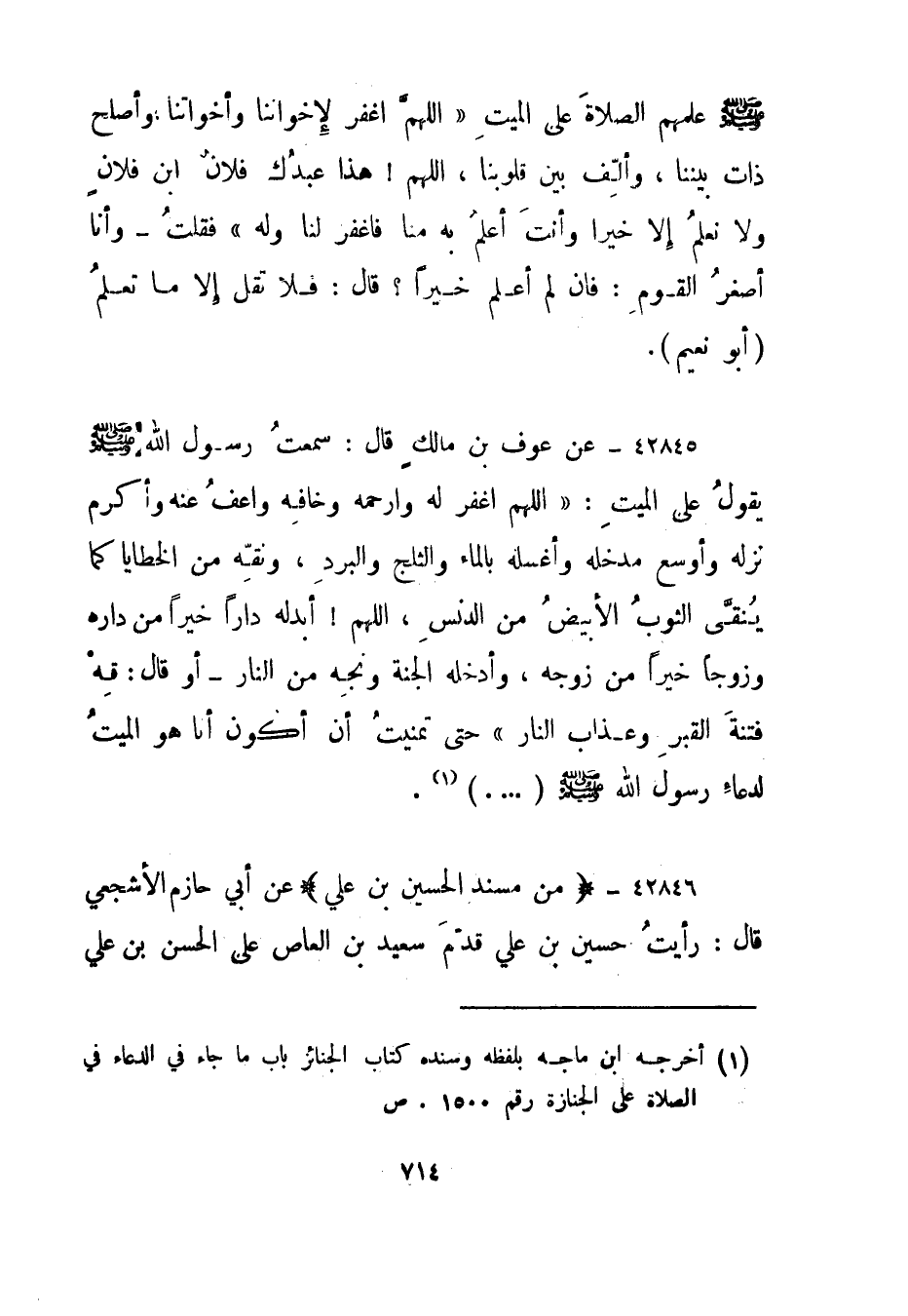 42845- عن عوف بن مالك قال: سمعت رسول الله صلى الله عليه وسلم يقول على الميت: "اللهم اغفر له وارحمه وخافه واعف عنه وأكرم نزله وأوسع مدخله وأغسله بالماء والثلج والبرد، ونقه من الخطايا كما ينقى الثوب الأبيض من الدنس، اللهم! أبدله دارا خيرا من داره وزوجا خيرا من زوجه، وأدخله الجنة ونجه من النار - أو قال: قه فتنة القبر وعذاب النار" حتى تمنيت أن أكون أنا هو الميت لدعاء رسول الله صلى الله عليه وسلم."..... "1