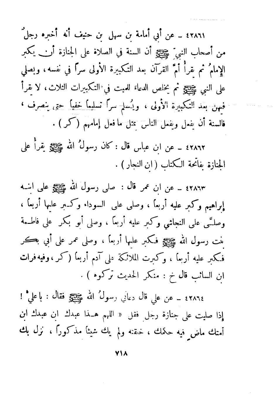 42863- عن ابن عمر قال: صلى رسول الله صلى الله عليه وسلم على ابنه إبراهيم وكبر عليه أربعا، وصلى على السوداء وكبر عليها أربعا، وصلى على النجاشي وكبر عليه أربعا، وصلى أبو بكر على فاطمة بنت رسول الله صلى الله عليه وسلم فكبر عليها أربعا، وصلى عمر على أبي بكر فكبر عليه أربعا، وكبرت الملائكة على آدم أربعا."كر، وفيه فرات ابن السائب قال خ: منكر الحديث تركوه".