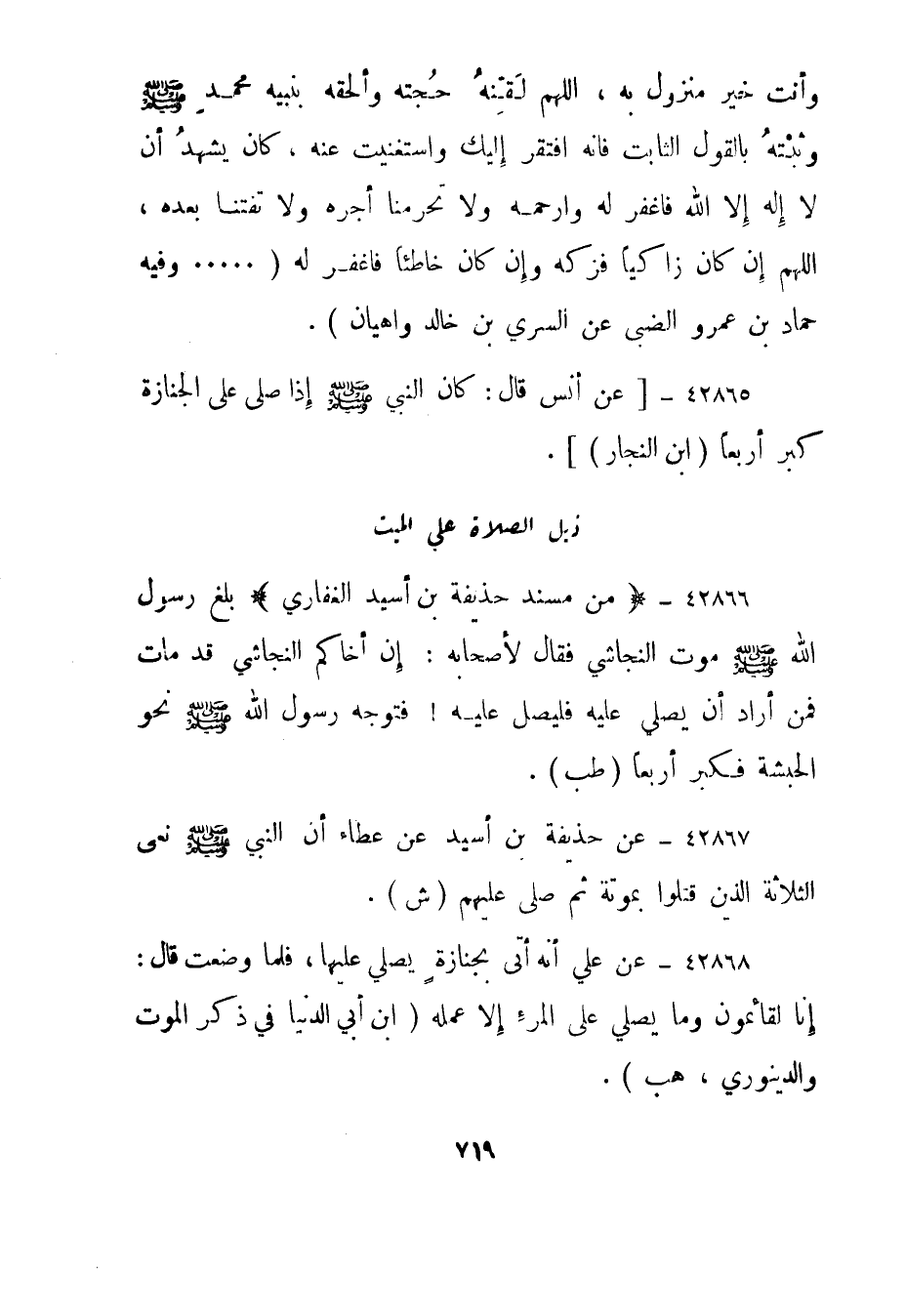 وأنت خير منزول به، اللهم لقنه حجته وألحقه بنبيه محمد صلى الله عليه وسلم وثبته بالقول الثابت فإنه افتقر إليك واستغنيت عنه، كان يشهد أن لا إله إلا الله فاغفر له وارحمه ولا تحرمنا أجره ولا تفتنا بعده، اللهم إن كان زاكيا فزكه وإن كان خاطئا فاغفر له."..... وفيه حماد بن عمرو الضبى عن السري بن خالد واهيان".