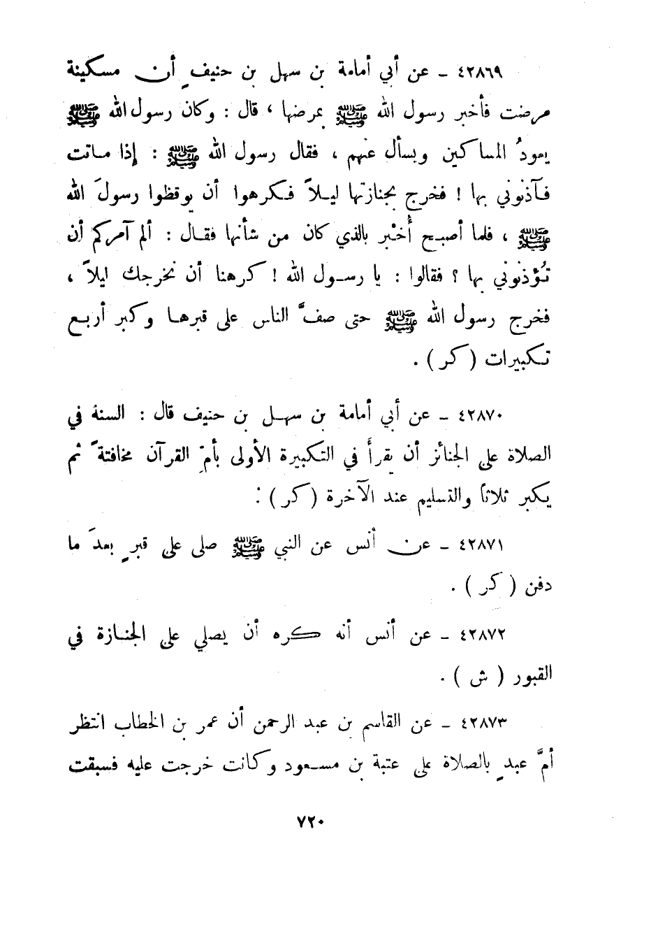 42869- عن أبي أمامة بن سهل بن حنيف أن مسكينة مرضت فأخبر رسول الله صلى الله عليه وسلم بمرضها، قال: وكان رسول الله صلى الله عليه وسلم يعود المساكين ويسأل عنهم، فقال رسول الله صلى الله عليه وسلم: إذا ماتت فآذنوني بها! فخرج بجنازتها ليلا فكرهوا أن يوقظوا رسول الله صلى الله عليه وسلم، فلما أصبح أخبر بالذي كان من شأنها فقال: ألم آمركم أن تؤذنوني بها؟ فقالوا: يا رسول الله! كرهنا أن نخرجك ليلا، فخرج رسول الله صلى الله عليه وسلم حتى صف الناس على قبرها وكبر أربع تكبيرات."كر".