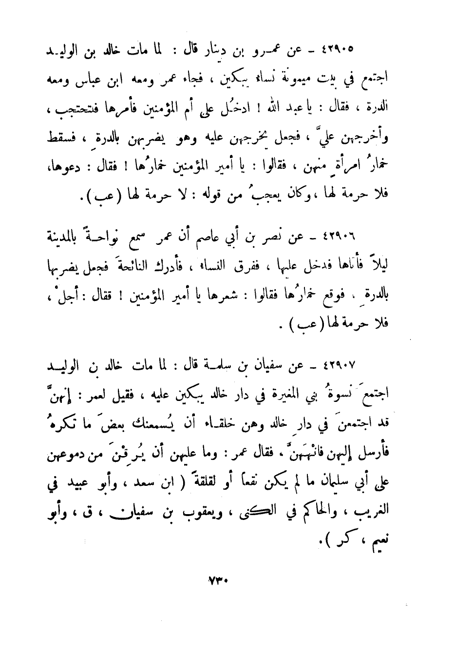 42905- عن عمرو بن دينار قال: لما مات خالد بن الوليد اجتمع في بيت ميمونة نساء يبكين، فجاء عمر ومعه ابن عباس ومعه الدرة، فقال: يا عبد الله! ادخل على أم المؤمنين فأمرها فلتحتجب، وأخرجهن علي، فجعل يخرجهن عليه وهو يضربهن بالدرة، فسقط خمار امرأة منهن، فقالوا: يا أمير المؤمنين خمارها! فقال: دعوها، فلا حرمة لها، وكان يعجب من قوله: لا حرمة لها."عب".