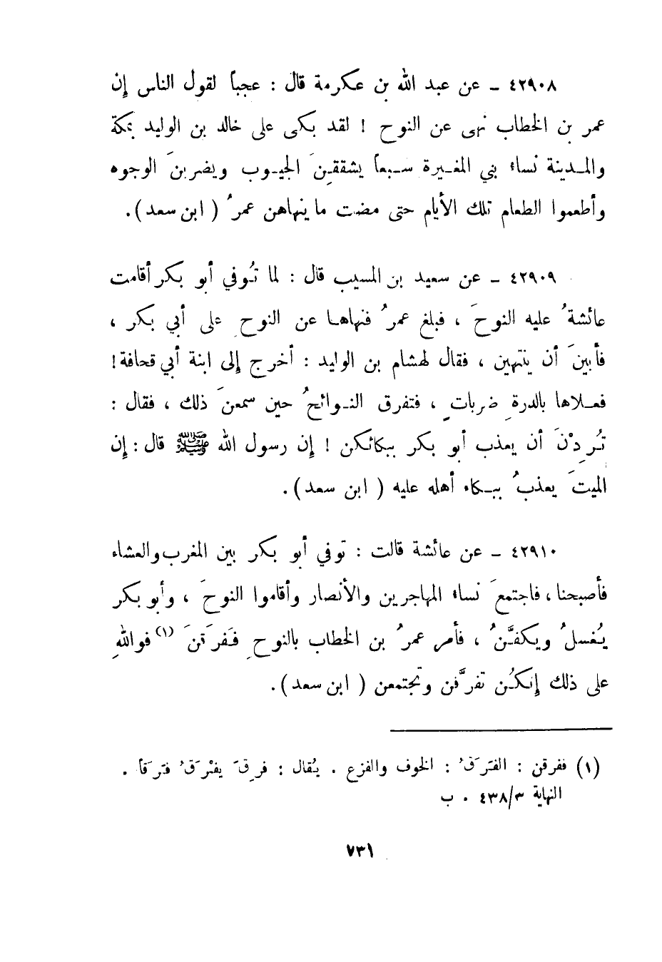 42910- عن عائشة قالت: توفي أبو بكر بين المغرب والعشاء فأصبحنا، فاجتمع نساء المهاجرين والأنصار وأقاموا النوح، وأبو بكر يغسل ويكفن، فأمر عمر بن الخطاب بالنوح ففرقن "1 فوالله على ذلك إنكن تفرقن وتجتمعن."ابن سعد".