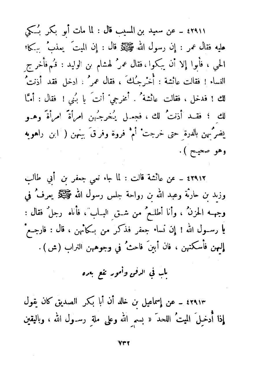 42911- عن سعيد بن المسيب قال: لما مات أبو بكر بكي عليه فقال عمر: إن رسول الله صلى الله عليه وسلم قال: إن الميت يعذب ببكاء الحي، فأبوا إلا أن يبكوا، فقال عمر لهشام بن الوليد: قم فأخرج النساء! فقالت عائشة: أخرجك، فقال عمر: ادخل فقد أذنت لك! فدخل، فقالت عائشة: أمخرجي أنت يا بني! فقال: أما لك؛ فقد أذنت لك، فجعل يخرجهن امرأة امرأة وهو يضربهن بالدرة حتى خرجت أم فروة وفرق بينهن."ابن راهويه وهو صحيح".