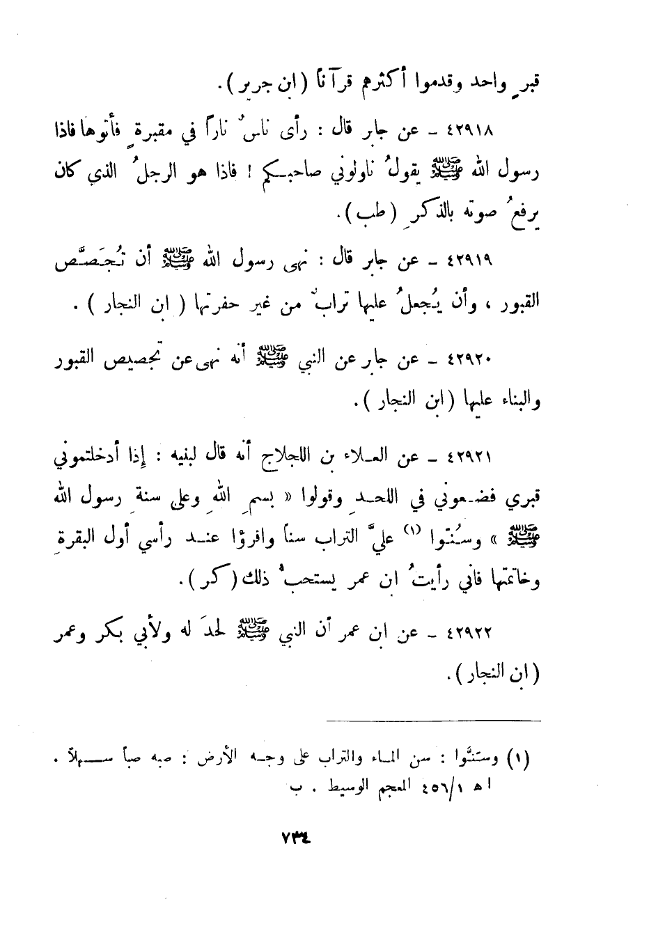 42920- عن جابر عن النبي صلى الله عليه وسلم أنه نهى عن تجصيص القبور والبناء عليها."ابن النجار".