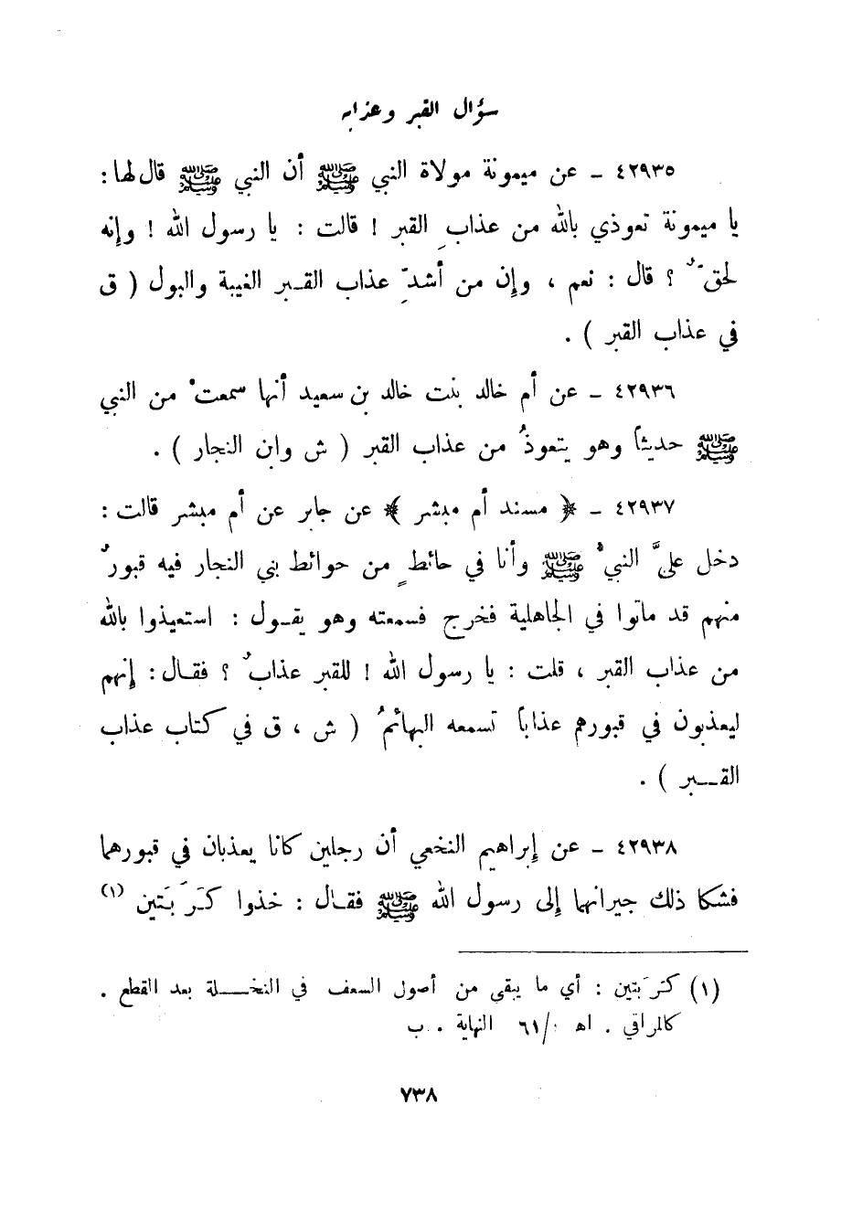42938- عن إبراهيم النخعي أن رجلين كانا يعذبان في قبورهما فشكا ذلك جيرانهما إلى رسول الله صلى الله عليه وسلم فقال: خذوا كربتين "1