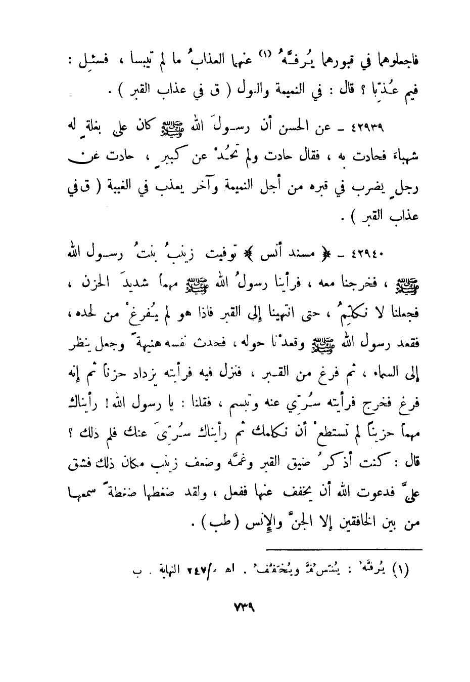 42939- عن الحسن أن رسول الله صلى الله عليه وسلم كان على بغلة له شهباء فحادت به، فقال حادت ولم تحد عن كبير، حادت عن رجل يضرب في قبره من أجل النميمة وآخر يعذب في الغيبة."ق في عذاب القبر".