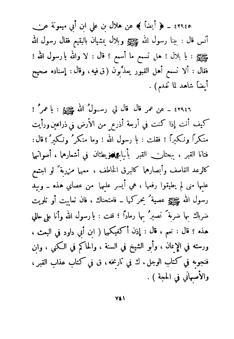 42946- عن عمر قال قال لي رسول الله صلى الله عليه وسلم: يا عمر! كيف أنت إذا كنت في أربعة أذرع من الأرض في ذراعين ورأيت منكرا ونكيرا! فقلت: يا رسول الله! وما منكر ونكير؟ قال: فتانا القبر، يبحثان القبر بأنيابهما ويطئان في أشعارهما، أصواتهما كالرعد القاصف وأبصارهما كالبرق الخاطف، معهما مزربة لو اجتمع عليها منى لم يطيقوا رفعها، هي أيسر عليهما من عصاي هذه - وبيد رسول الله صلى الله عليه وسلم عصية يحركها - ف امتحناك، فإن تعاييت أو تلويت ضرباك بها ضربة تصير بها رمادا؛ قلت: يا رسول الله وأنا على حالي هذه؟ قال: نعم، قال: إذن أكفيكهما."ابن أبي داود في البعث، ورسته في الإيمان، وأبو الشيخ في السنة، والحاكم في الكنى، وابن زنجويه في كتاب الوجل، م في تاريخه، ق في كتاب عذاب القبر، والأصبهاني في الحجة".