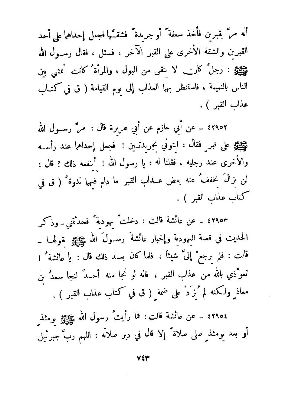 أنه مر بقبرين فأخذ سعفة أو جريدة فشقها فجعل إحداهما على أحد القبرين والشقة الأخرى على القبر الآخر، فسئل، فقال رسول الله صلى الله عليه وسلم: ر جل كان لا يتقى من البول، والمرأة كانت تمشي بين الناس بالنميمة، فاستنظر بهما العذاب إلى يوم القيامة."ق في كتاب عذاب القبر".