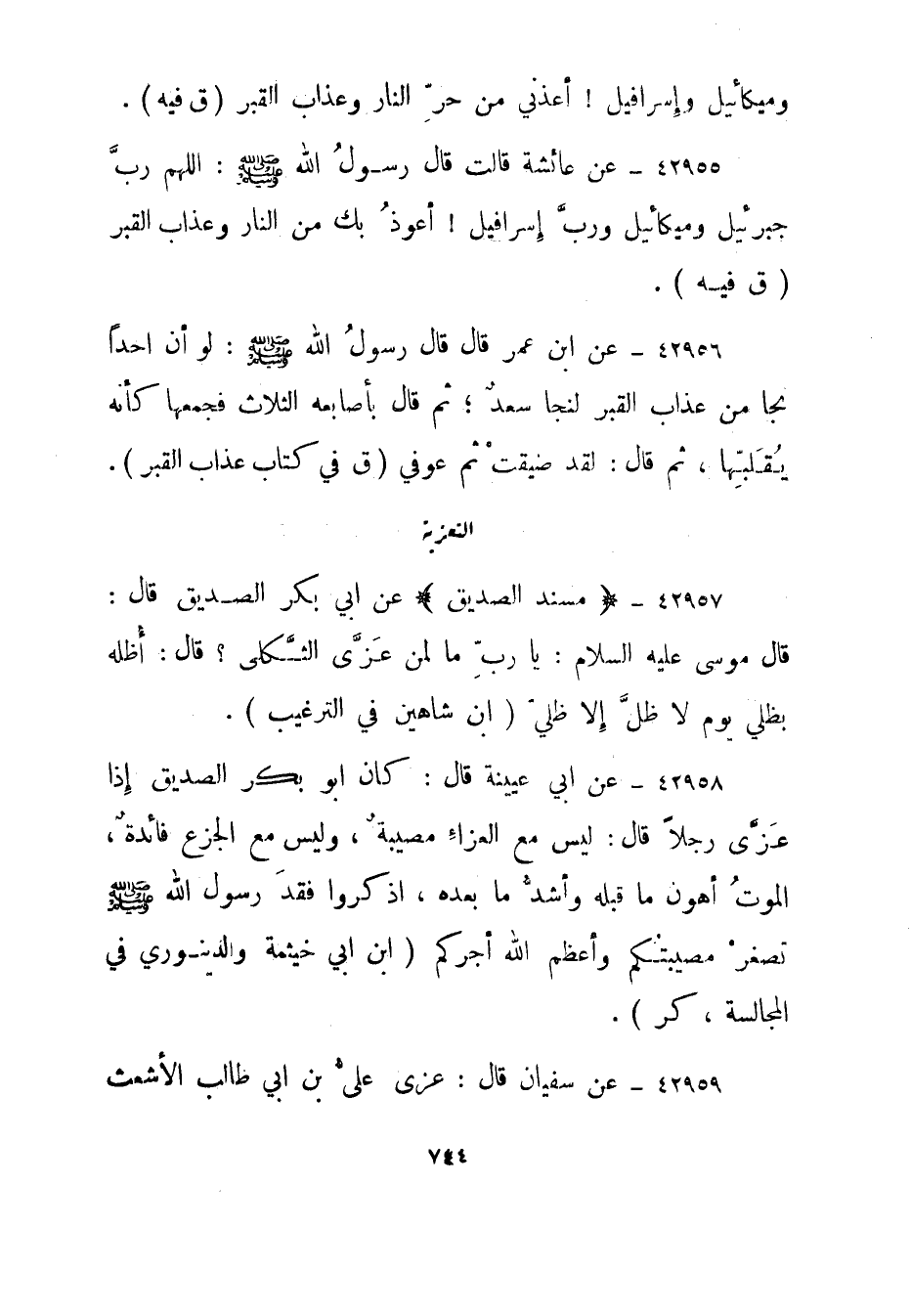 42958- عن أبي عيينة قال: كان أبو بكر الصديق إذا عزى رجلا قال: ليس مع العزاء مصيبة، وليس مع الجزع فائدة، الموت أهون ما قبله وأشد ما بعده، اذكروا فقد رسول الله صلى الله عليه وسلم تصغر مصيبتكم وأعظم الله أجركم."ابن أبي خيثمة والدينوري في المجالسة، كر".