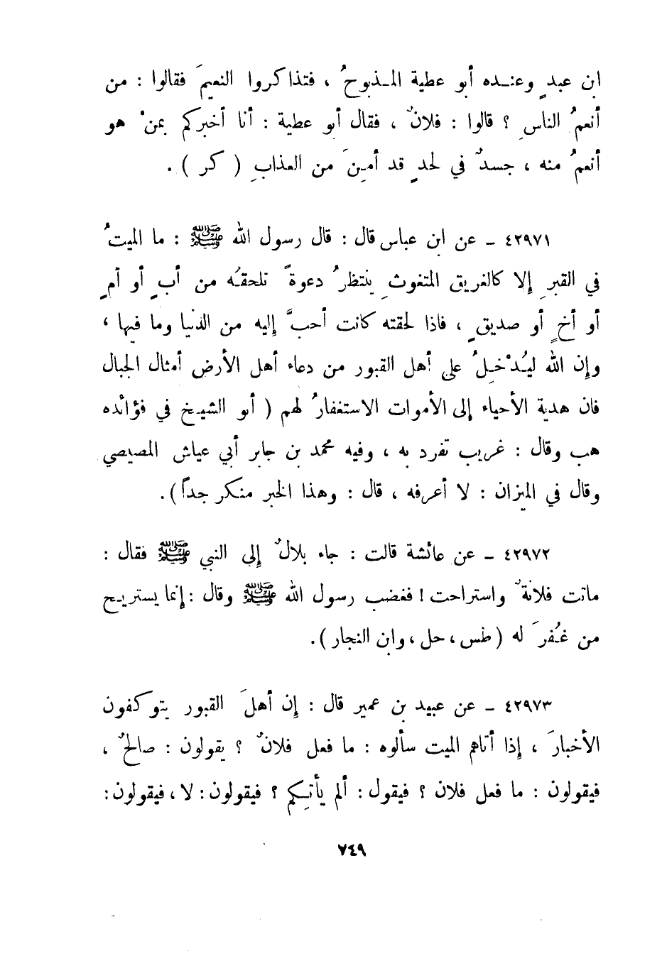 42973- عن عبيد بن عمير قال: إن أهل القبور يتوكفون الأخبار، إذا أتاهم الميت سألوه: ما فعل فلان؟ يقولون: صالح، فيقولون: ما فعل فلان؟ فيقول: ألم يأتكم؟ فيقولون: لا، فيقولون: