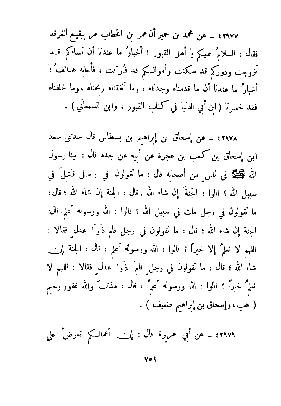 42977- عن محمد بن حمير أن عمر بن الخطاب مر ببقيع الغرقد فقال: السلام عليكم يا أهل القبور! أخبار ما عندنا أن نساءكم قد تزوجت ودوركم قد سكنت وأموالكم قد فرقت، فأجابه هاتف: أخبار ما عندنا أن ما قدمناه وجدناه، وما أنفقناه ريحناه، وما خلفناه فقد خسرنا."ابن أبي الدنيا في كتاب القبور، وابن السمعاني".