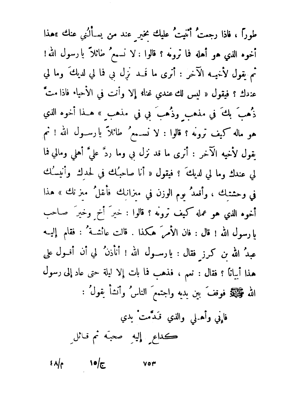 طورا، فإذا رجعت أثنيت عليك بخير عند من يسألني عنك" هذا أخوه الذي هو أهله فما ترونه؟ قالوا: لا نسمع طائلا يا رسول الله! ثم يقول لأخيه الآخر: أترى ما قد نزل بي فما لي لديك وما لي عندك؟ فيقول "ليس لك عندي غناء إلا وأنت في الأحياء فإذا مت ذهب بك في مذهب وذهب بي في مذهب" هذا أخوه الذي هو ماله كيف ترونه؟ قالوا: لا نسمع طائلا يا رسول الله! ثم يقول لأخيه الآخر: أترى ما قد نزل بي وما رد علي أهلي ومالي فما لي عندك وما لي لديك؟ فيقول "أنا صاحبك في لحدك وأنيسك في وحشتك، وأقعد يوم الوزن في ميزانك فأثقل ميزانك" هذا أخوه الذي هو عمله كيف ترونه؟ قالوا: خير أخ وخير صاحب يا رسول الله! قال: فإن الأمر هكذا. قالت عائشة: فقام إليه عبد الله بن كرز فقال: يا رسول الله! أتأذن لي أن أقول على هذا أبياتا؟ فقال: نعم، فذهب فما بات إلا ليلة حتى عاد إلى رسول الله صلى الله عليه وسلم فوقف بين يديه واجتمع الناس وأنشأ يقول:
