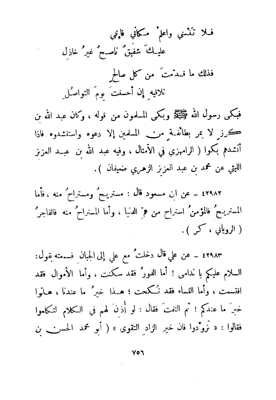 42983- عن علي قال دخلت مع علي إلى الجبان فسمعته يقول: السلام عليكم يا ندامى! أما الدور فقد سكنت، وأما الأموال فقد اقتسمت، وأما النساء فقد نكحت؛ هذا خير ما عندنا، هاتوا خير ما عندكم! ثم التفت فقال: لو أذن لهم في الكلام لتكلموا فقالوا: "تزودوا فإن خير الزاد التقوى"."أبو محمد الحسن بن