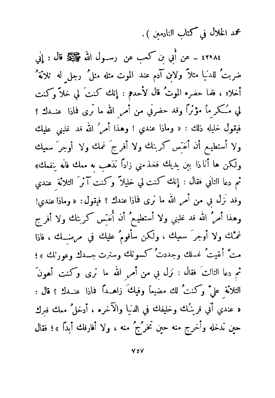 42984- عن أبي بن كعب عن رسول الله صلى الله عليه وسلم قال: إن ي ضربت للدنيا مثلا ولابن آدم عند الموت مثله مثل رجل له ثلاثة أخلاء، فلما حضره الموت قال لأحدهم: إنك كنت لي خلا وكنت لي مكرما مؤثرا وقد حضرني من أمر الله ما ترى فماذا عندك؟ فيقول خليله ذلك: "وماذا عندي! وهذا أمر الله قد غلبني عليك ولا أستطيع أن أنفس كربتك ولا أفرج غمك ولا أوجر سعيك ولكن ها أنا ذا بين يديك فخذ مني زادا تذهب به معك فإنه ينفعك" ثم دعا الثاني فقال: إنك كنت لي خليلا وكنت آثر الثلاثة عندي وقد نزل بي من أمر الله ما ترى فماذا عندك؟ فيقول: "وماذا عندي! وهذا أمر الله قد غلبني ولا أستطيع أن أنفس كربتك ولا أفرج غمك ولا أوجر سعيك، ولكن سأقوم عليك في مرضك، فإذا مت أنقيت؟ غسلك وجددت كسوتك وسترت جسدك وعورتك"؛ ثم دعا الثالث فقال: نزل بي من أمر الله ما ترى وكنت أهون الثلاثة علي وكنت لك مضيعا وفيك زاهدا فماذا عندك؟ قال: "عندي أني قرينك وخليفك في الدنيا والآخرة، أدخل معك قبرك حين تدخله وأخرج منه حين تخرج منه، ولا أفارقك أبدا"؛ فقال