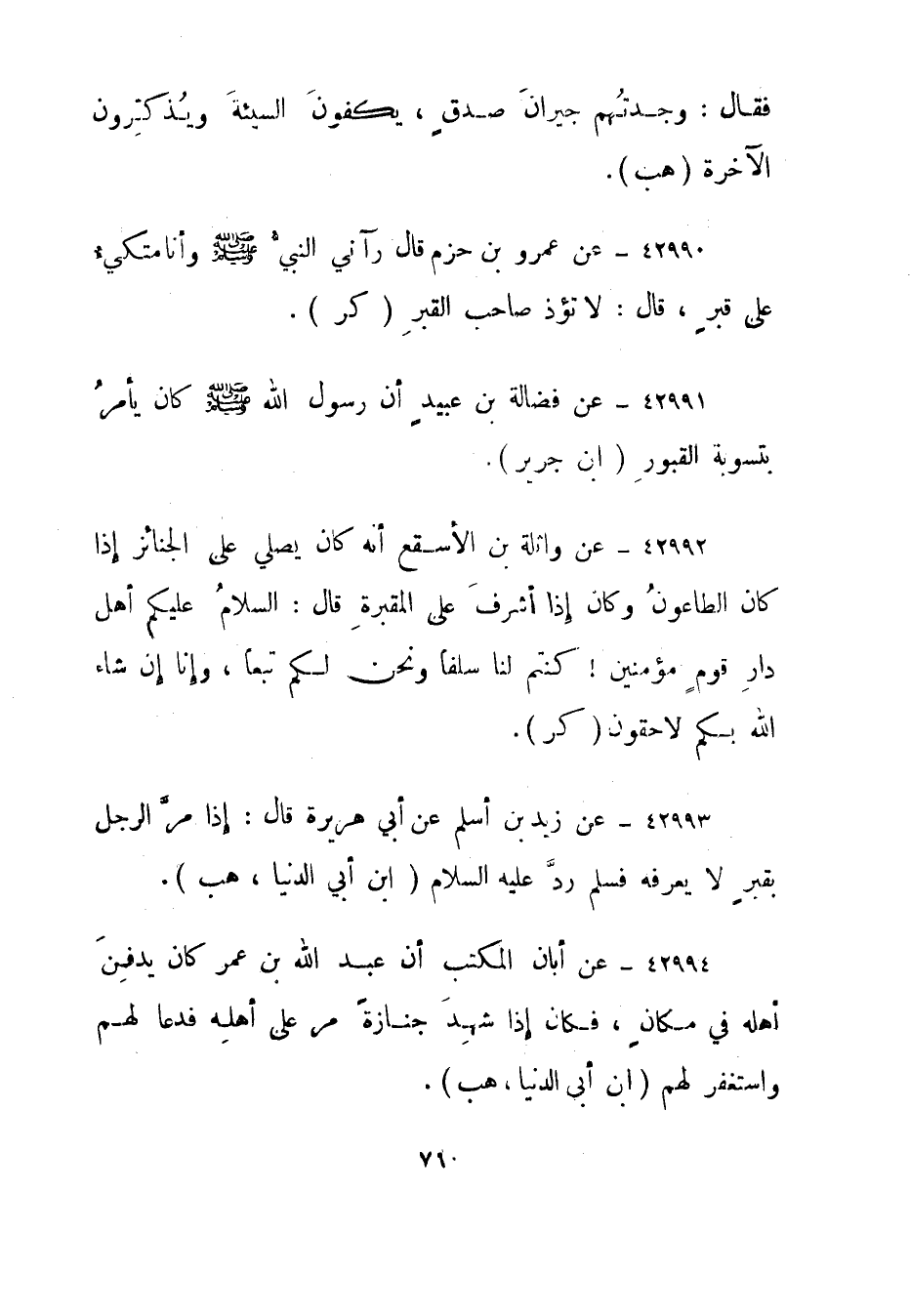 42993- عن زيد بن أسلم عن أبي هريرة قال: إذا مر الرجل بقبر لا يعرفه فسلم رد عليه السلام."ابن أبي الدنيا، هب".