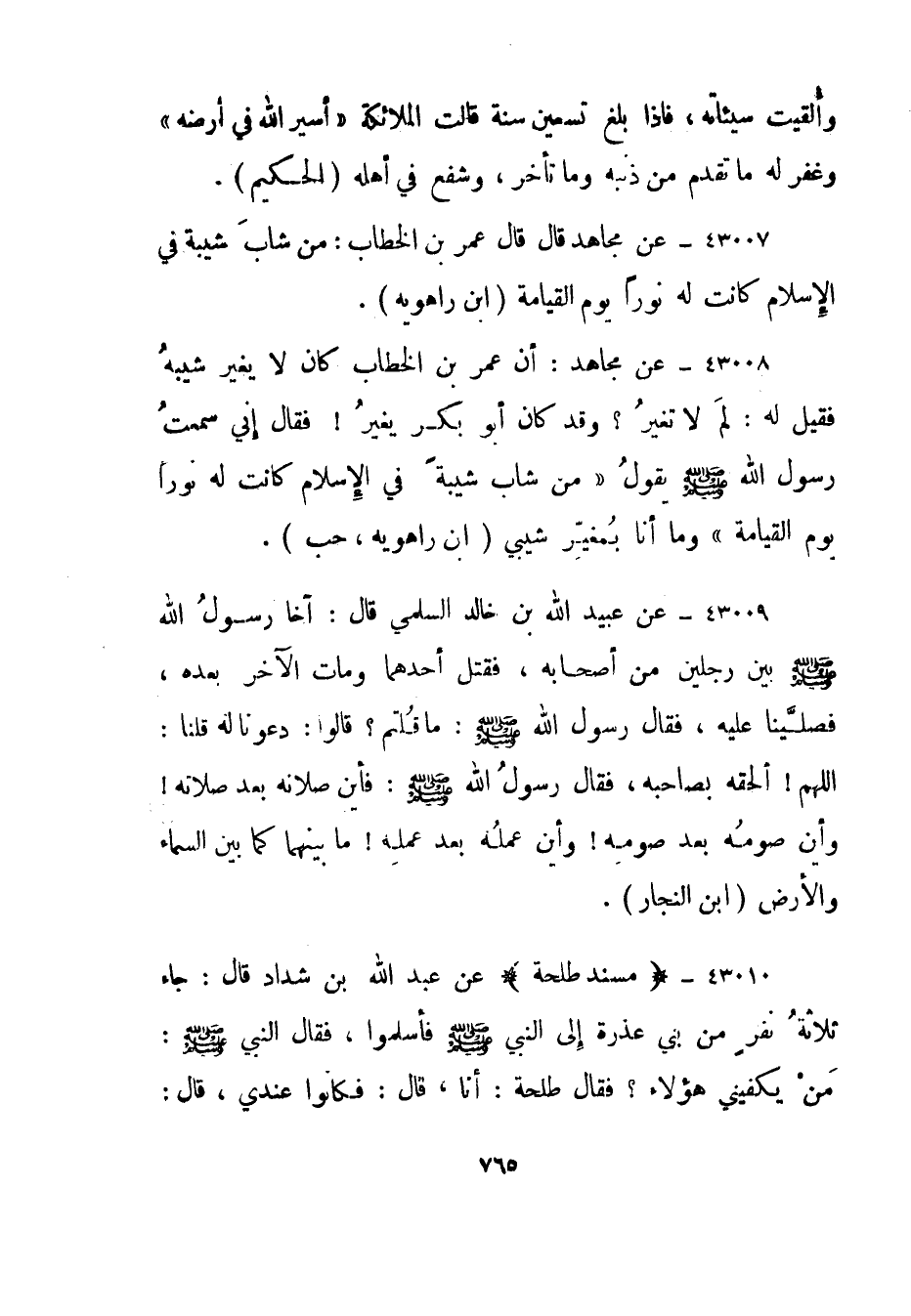 43007- عن مجاهد قال قال عمر بن الخطاب: من شاب شيبة في الإسلام كانت له نورا يوم القيامة."ابن راهويه".