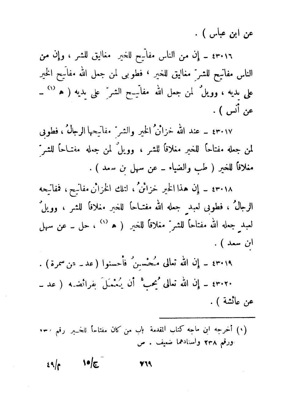 43018- إن هذا الخير خزائن، لتلك الخزائن مفاتيح، فمفاتيحه الرجال، فطوبى لعبد جعله الله مفتاحا للخير مغلاقا للشر، وويل لعبد جعله الله مفتاحا للشر مغلاقا للخير." هـ "1، حل - عن سهل ابن سعد".