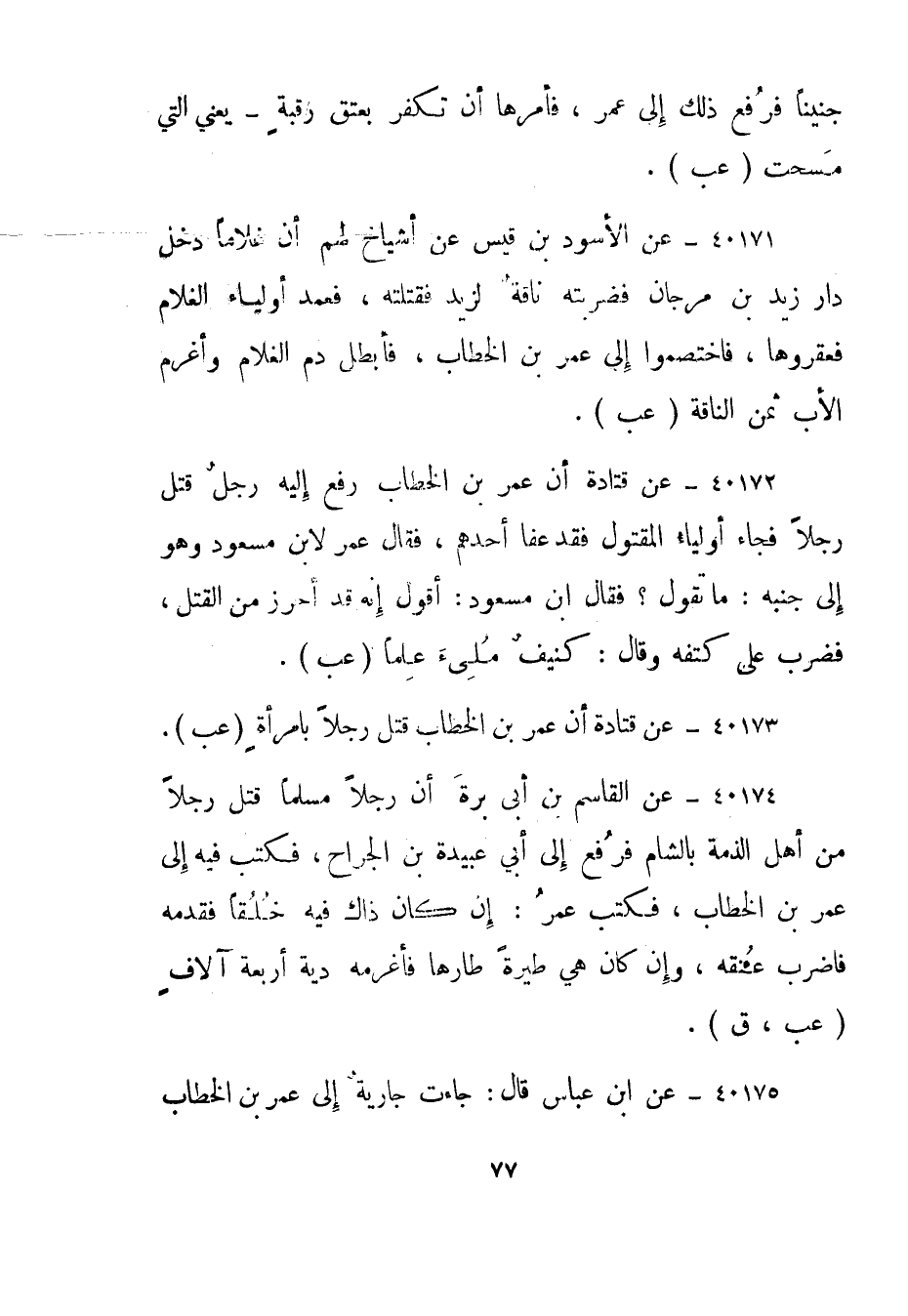40171- عن الأسود بن قيس عن أشياخ لهم أن غلاما دخل دار زيد بن مرجان فضربته ناقة لزيد فقتلته، فعمد أولياء الغلام فعقروها، فاختصموا إلى عمر بن الخطاب، فأبطل دم الغلام وأغرم الأب ثمن الناقة."عب".