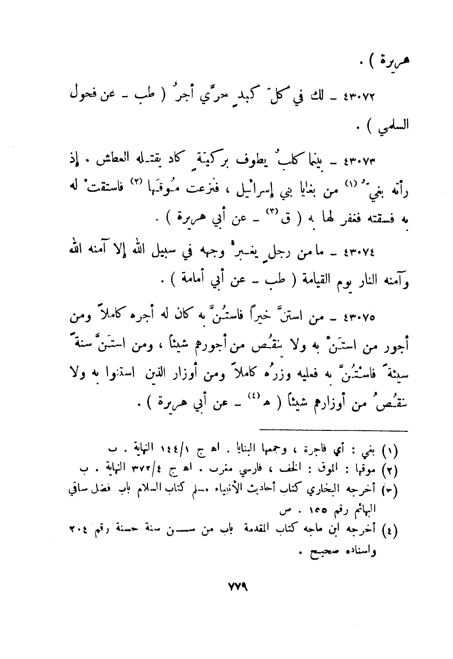43075- من استن خيرا فاستن به كان له أجره كاملا ومن أجور من استن به ولا ينقص من أجورهم شيئا، ومن استن سنة سيئة فاستن به فعليه وزره كاملا ومن أوزار الذين استنوا به ولا ينقص من أوزارهم شيئا. "هـ "4 - عن أبي هريرة".