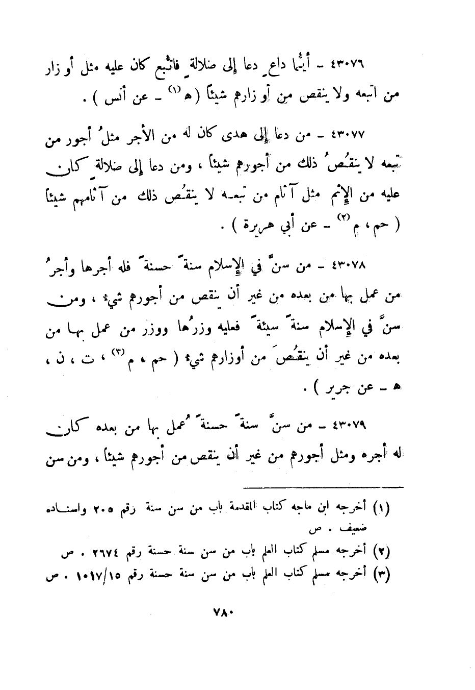 43079- من سن سنة حسنة عمل بها من بعده كان له أجره ومثل أجورهم من غير أن ينقص من أجورهم شيئا، ومن سن