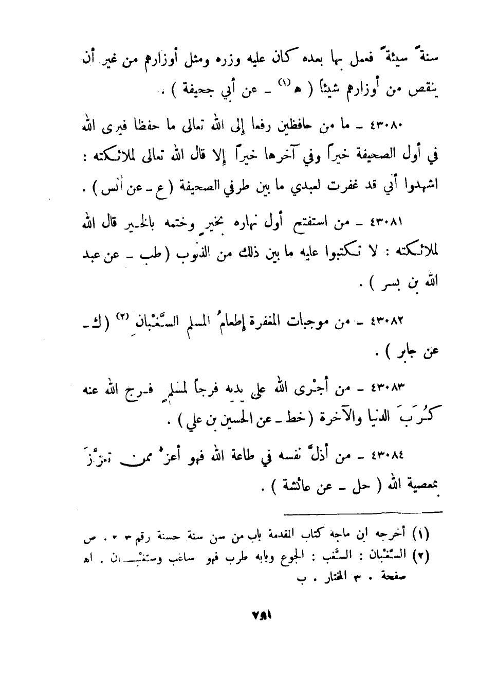 سنة سيئة فعمل بها بعده كان عليه وزره ومثل أوزارهم من غير أن ينقص من أوزارهم شيئا."هـ "1 عن أبي جحيفة".