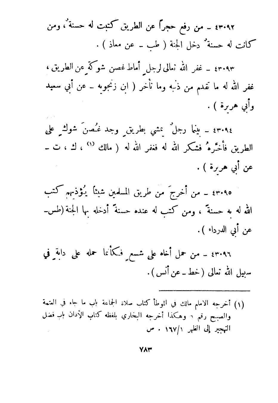 43093- غفر الله تعالى لرجل أماط غصن شوكة عن الطريق، غفر الله له ما تقدم من ذنبه وما تأخر. "ابن زنجويه - عن أبي سعيد وأبي هريرة".