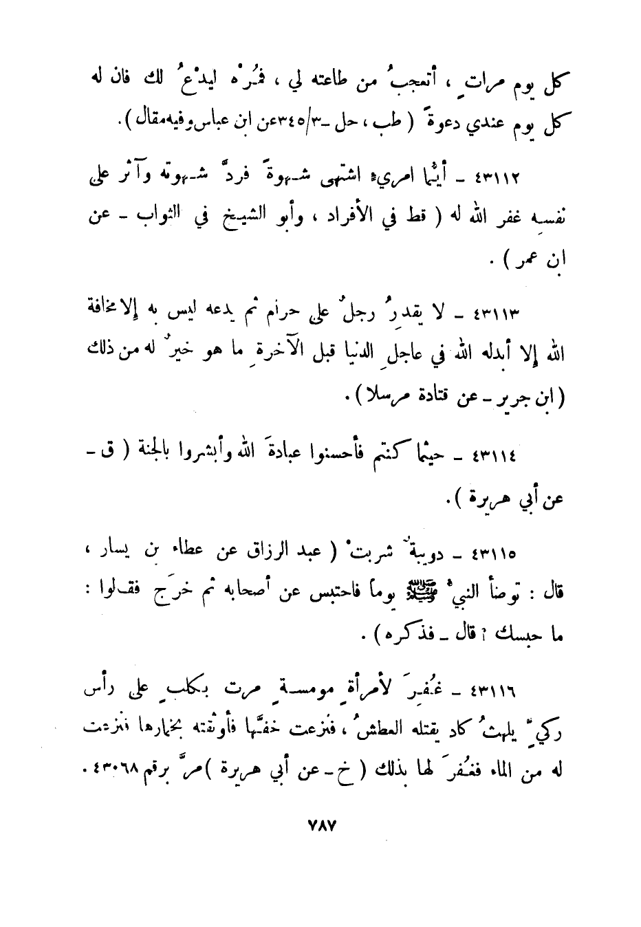 43112- أيما امرئ اشتهى شهوة فرد شهوته وآثر على نفسه غفر الله له."قط في الأفراد، وأبو الشيخ في الثواب - عن ابن عمر".