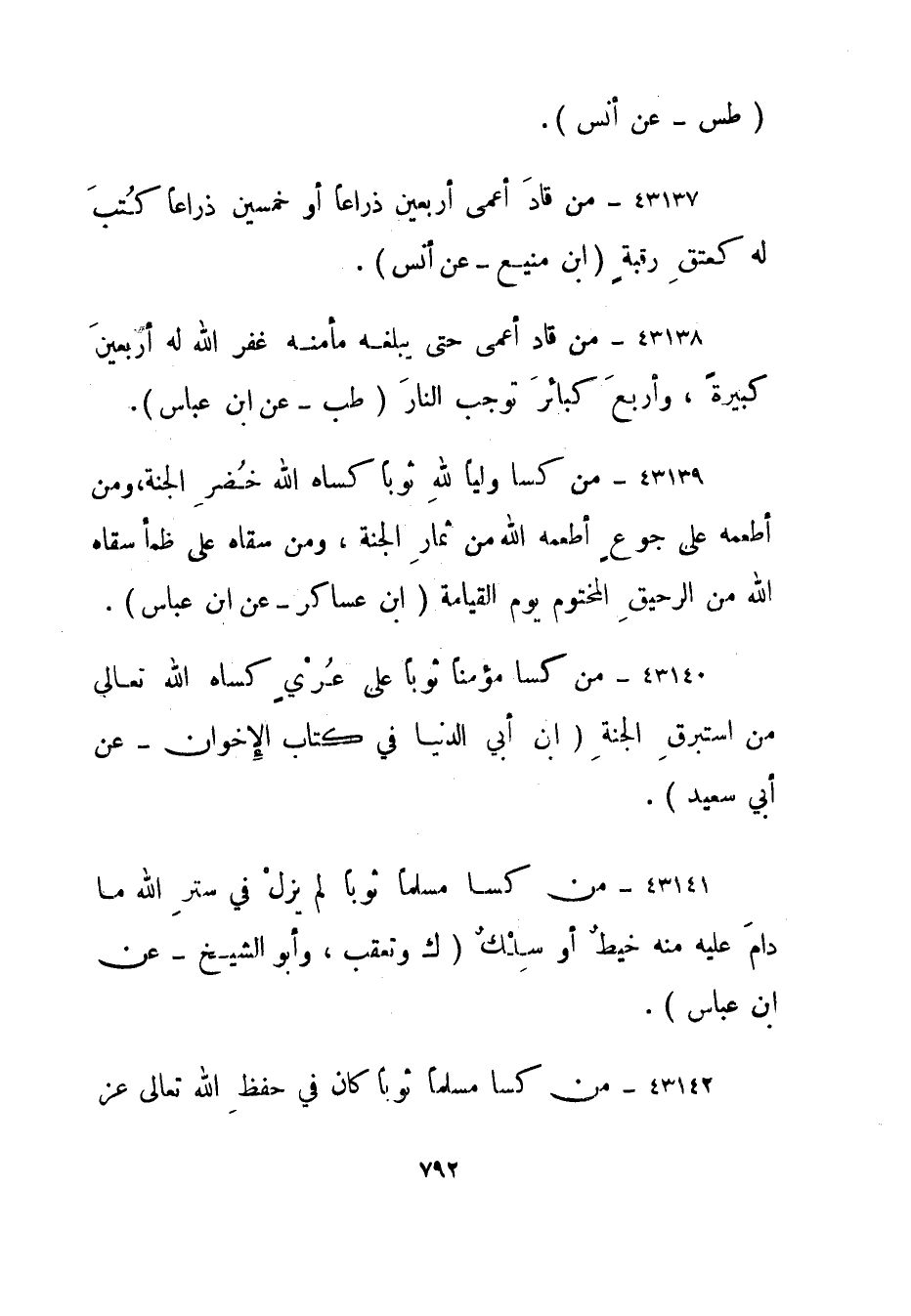43140- من كسا مؤمنا ثوبا على عري كساه الله تعالى من استبرق الجنة."ابن أبي الدنيا في كتاب الإخوان - عن أبي سعيد".