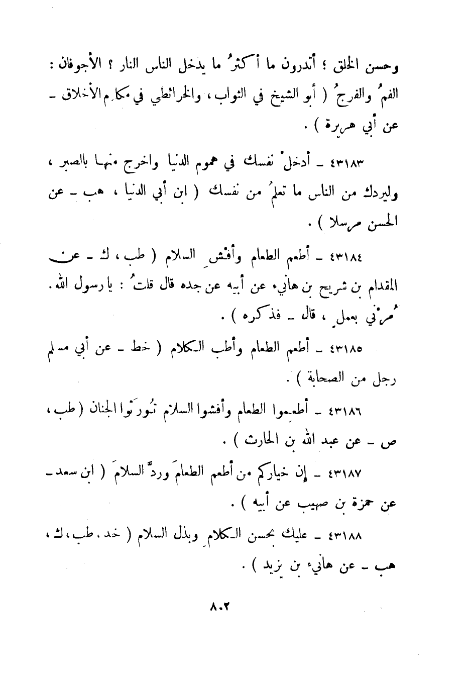 43187- إن خياركم من أطعم الطعام ورد السلام."ابن سعد - عن حمزة بن صهيب عن أبيه".