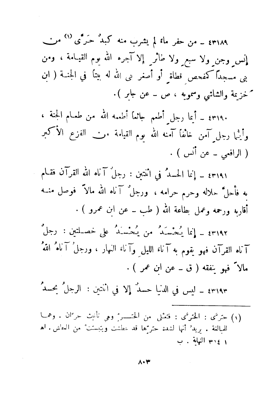 43189- من حفر ماء لم يشرب منه كبد حرى "1 من إنس وجن ولا سبع ولا طائر إلا آجره الله يوم القيامة، ومن بنى مسجدا كمفحص قطاة أو أصغر بنى الله له بيتا في الجنة."ابن خزيمة والشاشي وسمويه، ص - عن جابر".