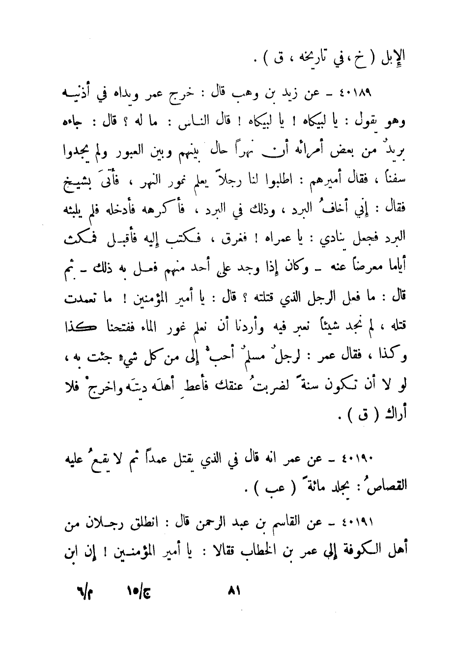 40189- عن زيد بن وهب قال: خرج عمر ويداه في أذنيه وهو يقول: يا لبيكاه! يا لبيكاه! قال الناس: ما له؟ قال: جاءه بريد من بعض أمرائه أن نهرا حال بينهم وبين العبور ولم يجدوا سفنا، فقال أميرهم: اطلبوا لنا رجلا يعلم غور النهر، فأتى بشيخ فقال: إني أخاف البرد، وذلك في البرد، فأكرهه فأدخله فلم يلبثه البرد فجعل ينادي: يا عمراه! فغرق، فكتب إليه فأقبل فمكث أياما معرضا عنه - وكان إذا وجد على أحد منهم فعل به ذلك - ثم قال: ما فعل الرجل الذي قتلته؟ قال: يا أمير المؤمنين! ما تعمدت قتله، لم نجد شيئا نعبر فيه وأردنا أن نعلم غور الماء ففتحنا كذا وكذا، فقال عمر: لرجل مسلم أحب إلي من كل شيء جئت به، لولا أن تكون سنة لضربت عنقك فأعط أهله ديته واخرج فلا أراك."ق".