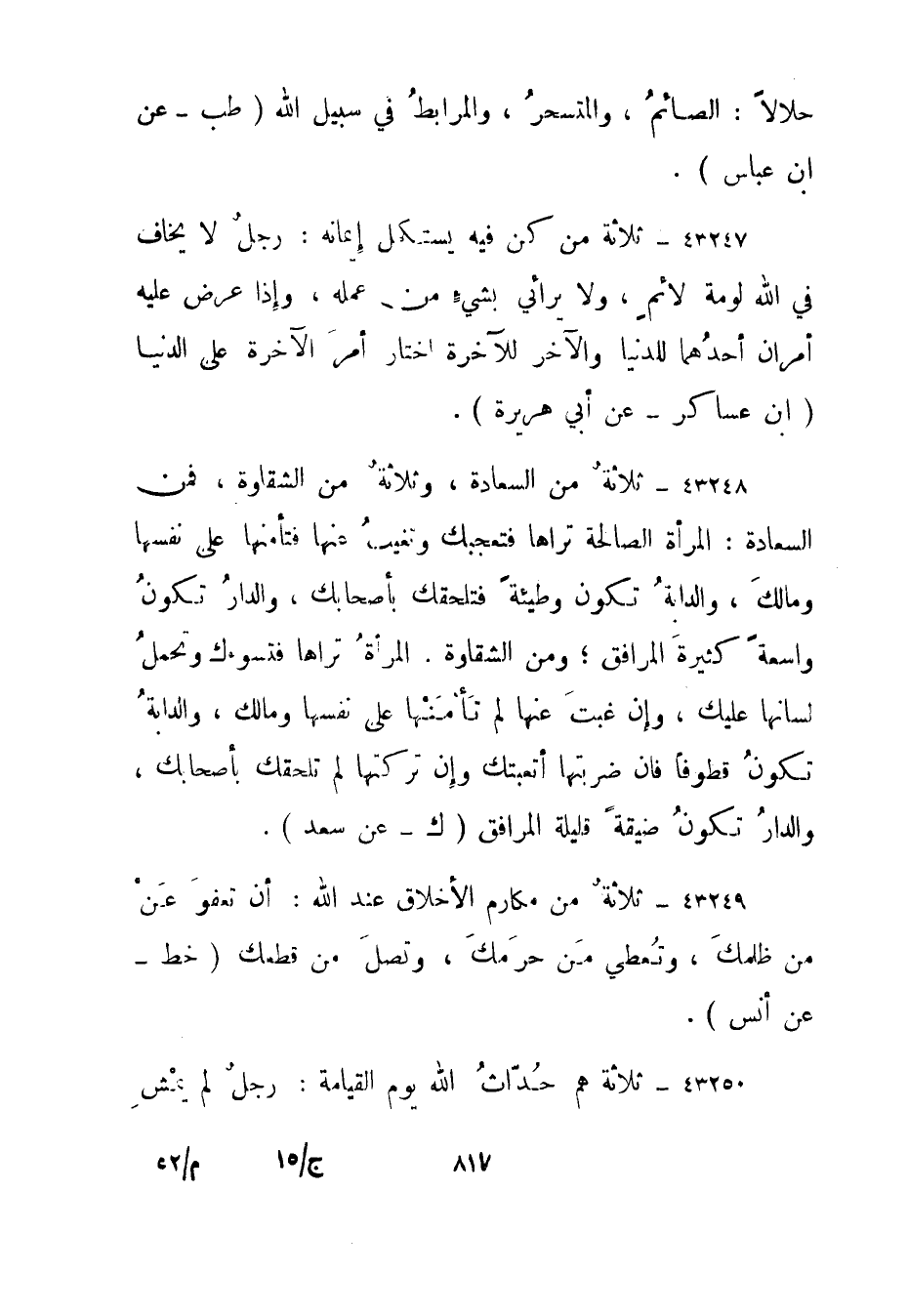 43247- ثلاثة من كن فيه يستكمل إيمانه: رجل لا يخاف في الله لومة لائم، ولا يرائي بشيء من عمله، وإذا عرض عليه أمران أحدهما للدنيا والآخر للآخرة اختار أمر الآخرة على الدنيا."ابن عساكر - عن أبي هريرة".