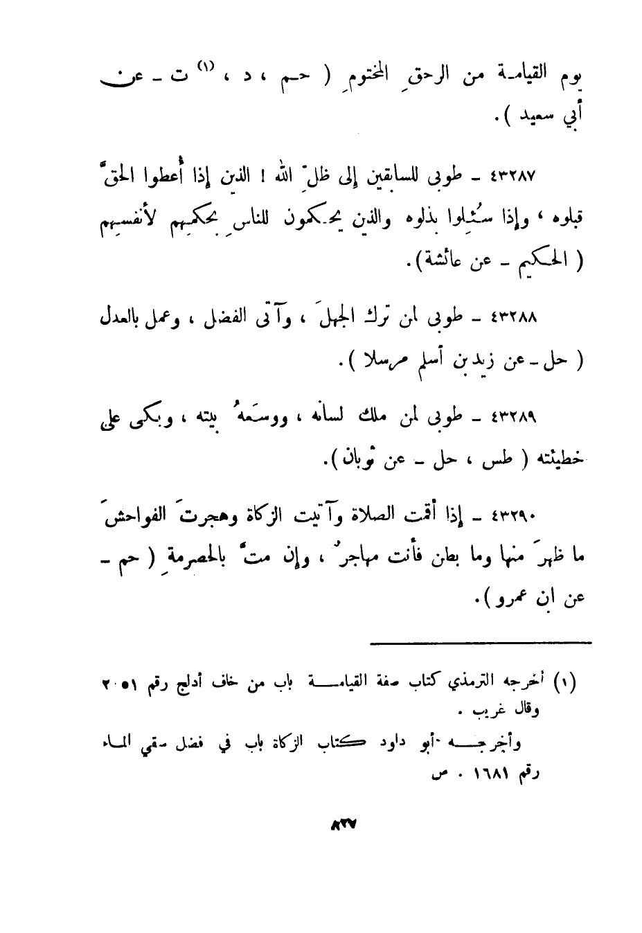 43287- طوبى للسابقين إلى ظل الله! الذين إذا أعطوا الحق قبلوه، وإذا سئلوا بذلوه والذين يحكمون للناس بحكمهم لأنفسهم."الحكيم - عن عائشة".
