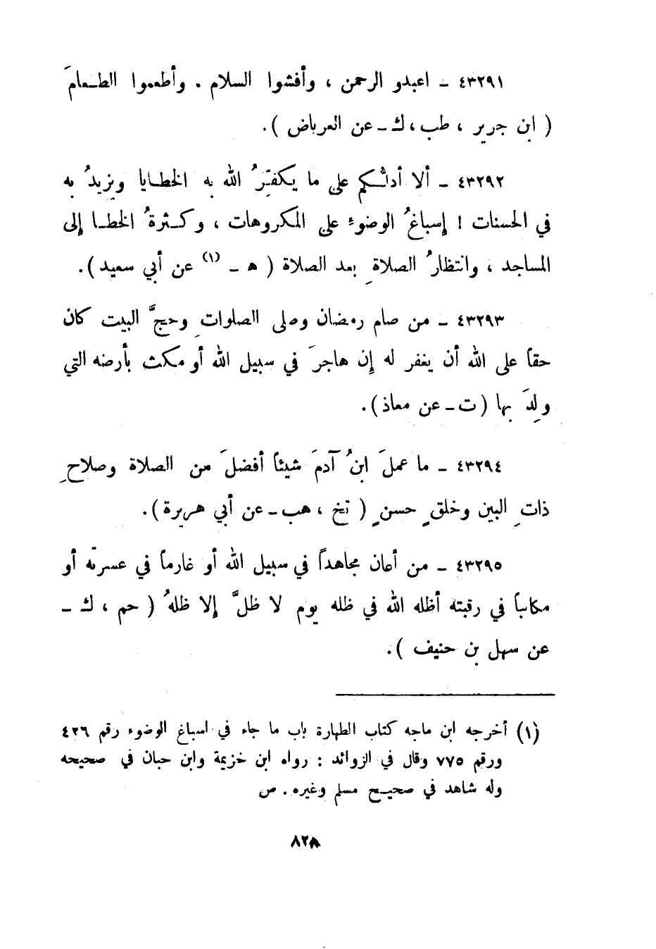 43291- اعبدوا الرحمن، وأفشوا السلام، وأطعموا الطعام."ابن جرير، طب، ك - عن العرباض".