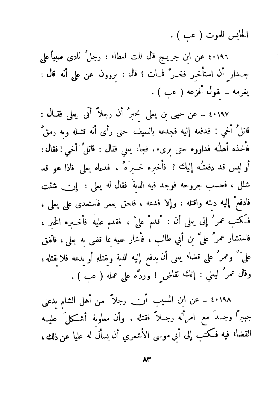 40198- عن ابن المسيب أن رجلا من أهل الشام يدعى جبيرا وجد مع امرأته رجلا فقتله، وأن معاوية أشكل عليه القضاء فيه فكتب إلى أبي موسى الأشعري أن يسأل له عليا عن ذلك،