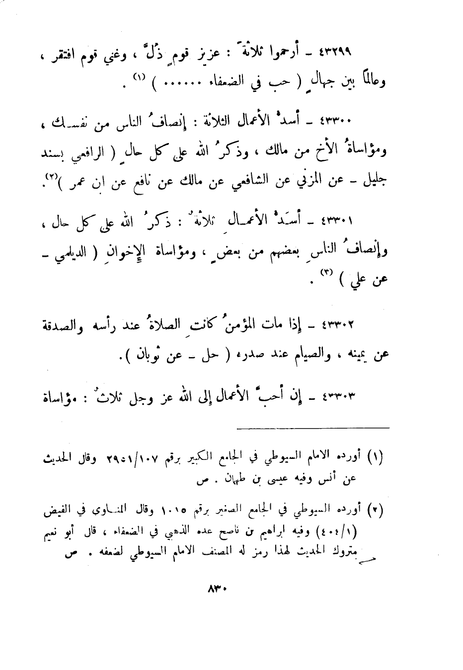 43300- أسد الأعمال الثلاثة: إنصاف الناس من نفسك، ومؤاساة الأخ من مالك، وذكر الله على كل حال."الرافعي بسند جليل - عن المزني عن الشافعي عن مالك عن نافع عن ابن عمر" "2