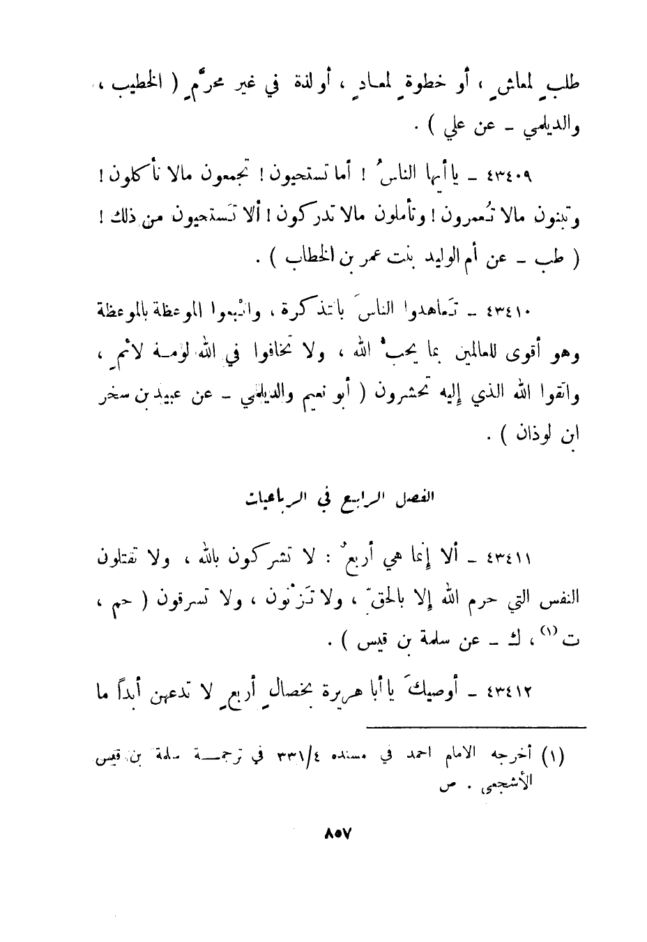 43411- ألا إنما هي أربع: لا تشركون بالله، ولا تقتلون النفس التي حرم الله إلا بالحق، ولا تزنون، ولا تسرقون."حم، ت "1، ك - عن سلمة بن قيس".