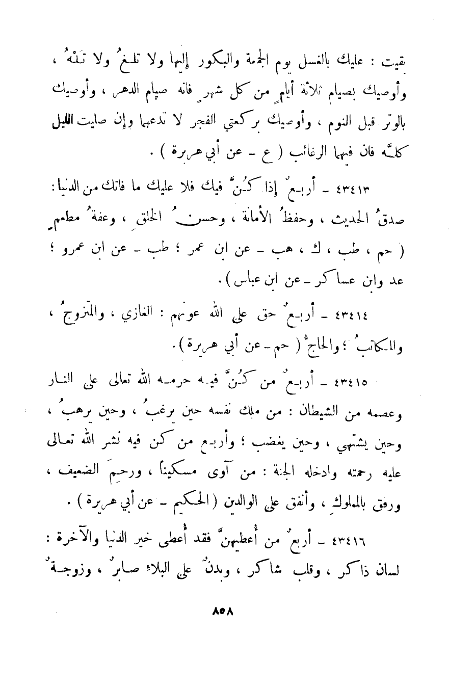 43415- أربع من كن فيه حرمه الله تعالى على النار وعصمه من الشيطان؛ من ملك نفسه حين يرغب، وحين يرهب، وحين يشتهي، وحين يغضب؛ وأربع من كن فيه نشر الله تعالى عليه رحمته وادخله الجنة: من آوى مسكينا، ورحم الضعيف، ورفق بالمملوك، وأنفق على الوالدين."الحكيم - عن أبي هريرة".