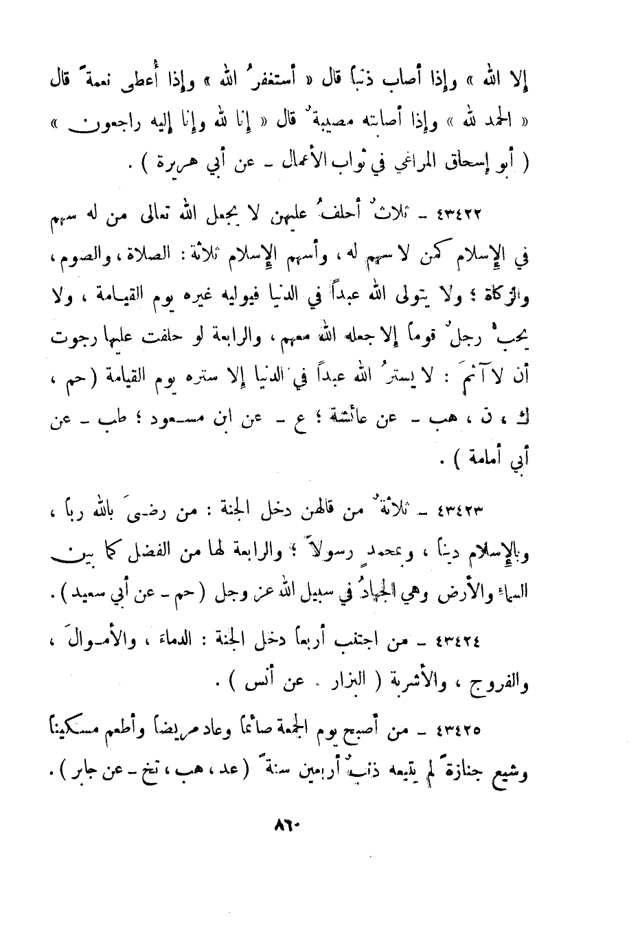 43422- ثلاث أحلف عليهن لا يجعل الله تعالى من له سهم في الإسلام كمن لا سهم له، وأسهم الإسلام ثلاثة: الصلاة، والصوم، والزكاة؛ ولا يتولى الله عبدا في الدنيا فيوليه غيره يوم القيامة، ولا يحب رجل قوما إلا جعله الله معهم، والرابعة لو حلفت عليها رجوت أن لا آثم: لا يستر الله عبدا في الدنيا إلا ستره يوم القيامة."حم، ك، ن، هب - عن عائشة؛ ع - عن ابن مسعود؛ طب - عن أبي أمامة".