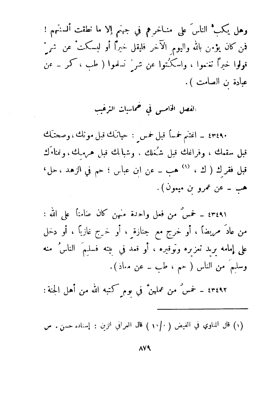 43490- اغتنم خمسا قبل خمس: حياتك قبل موتك، وصحتك قبل سقمك، وفراغك قبل شغلك، وشبابك قبل هرمك، وغناءك قبل فقرك." ك، "1 هب - عن ابن عباس؛ حم في الزهد، حل، هب - عن عمرو بن ميمون".