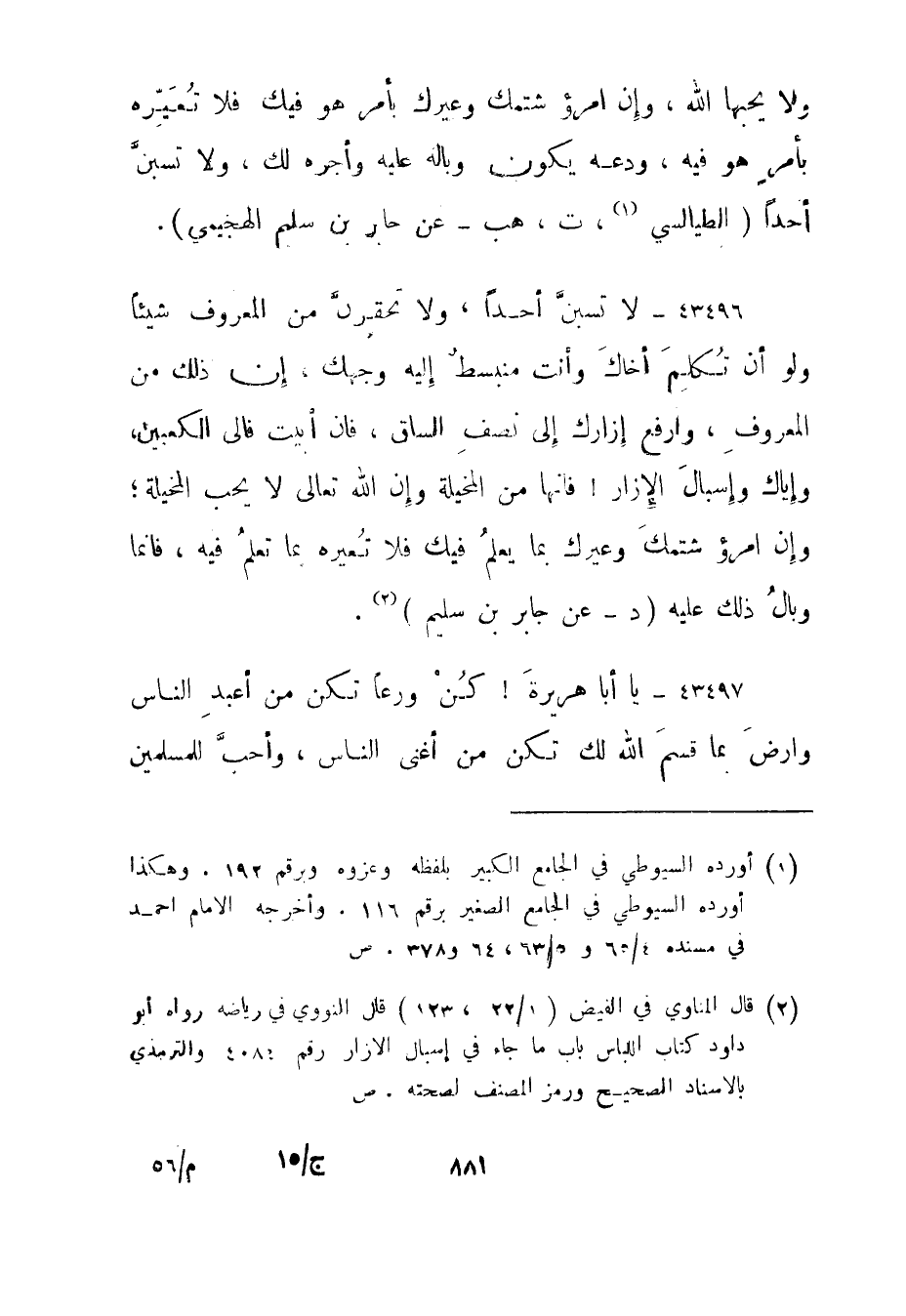 43496- لا تسبن أحدا، ولا تحقرن من المعروف شيئا ولو أن تكلم أخاك وأنت منبسط إليه وجهك، إن ذلك من المعروف، وارفع إزارك إلى نصف الساق، فإن أبيت فإلى الكعبين، وإياك وإسبال الإزار! فإنها من المخيلة وإن الله تعالى لا يحب المخيلة؛ وإن امرؤ شتمك وعيرك بما يعلم فيك فلا تعيره بما تعلم فيه، فإنما وبال ذلك عليه."د - عن جابر بن سليم" 2