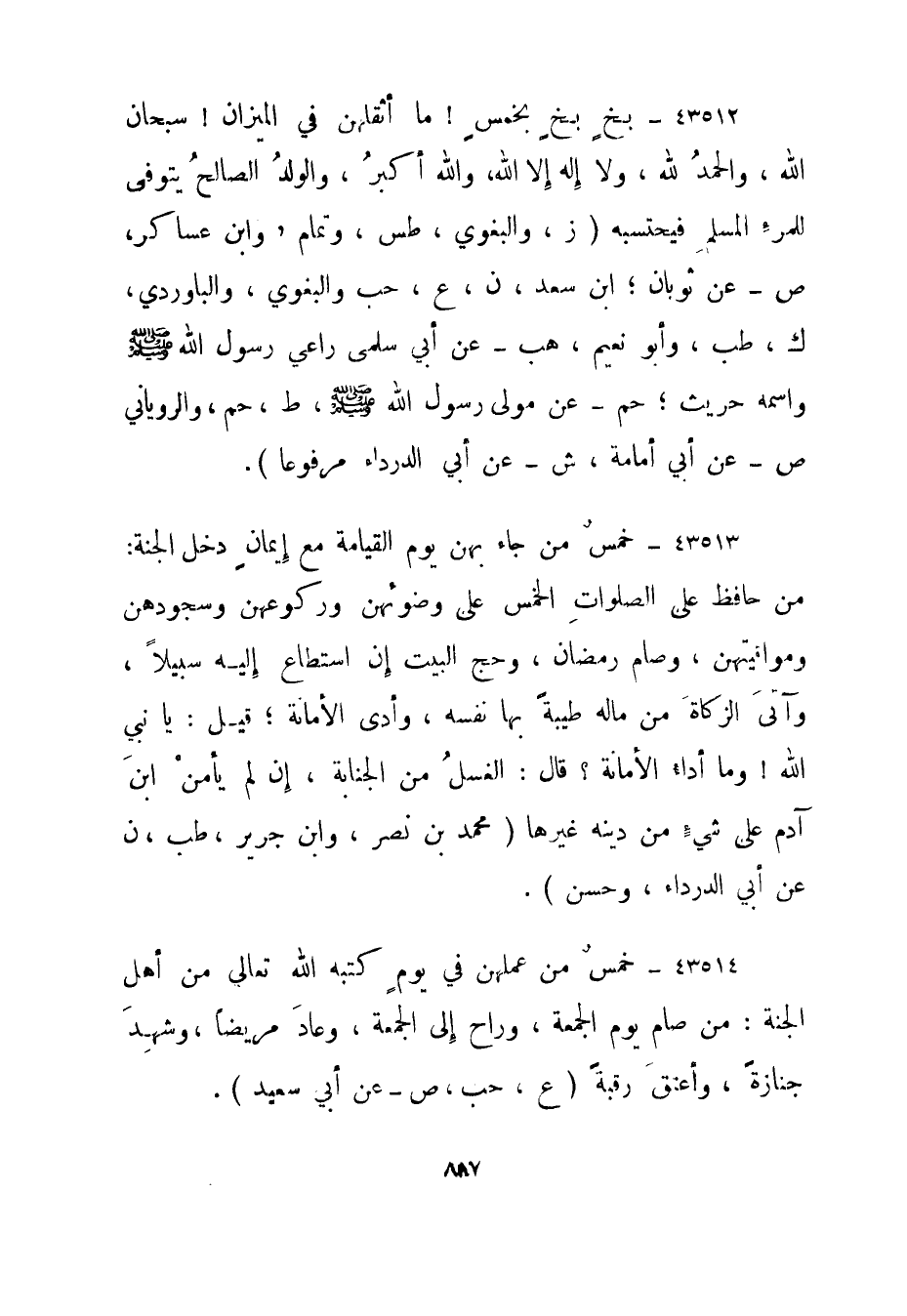 43512- بخ بخ بخمس! ما أثقلهن في الميزان! سبحان الله، والحمد لله، ولا إله إلا الله، والله أكبر، والولد الصالح يتوفى للمرء المسلم فيحتسبه.