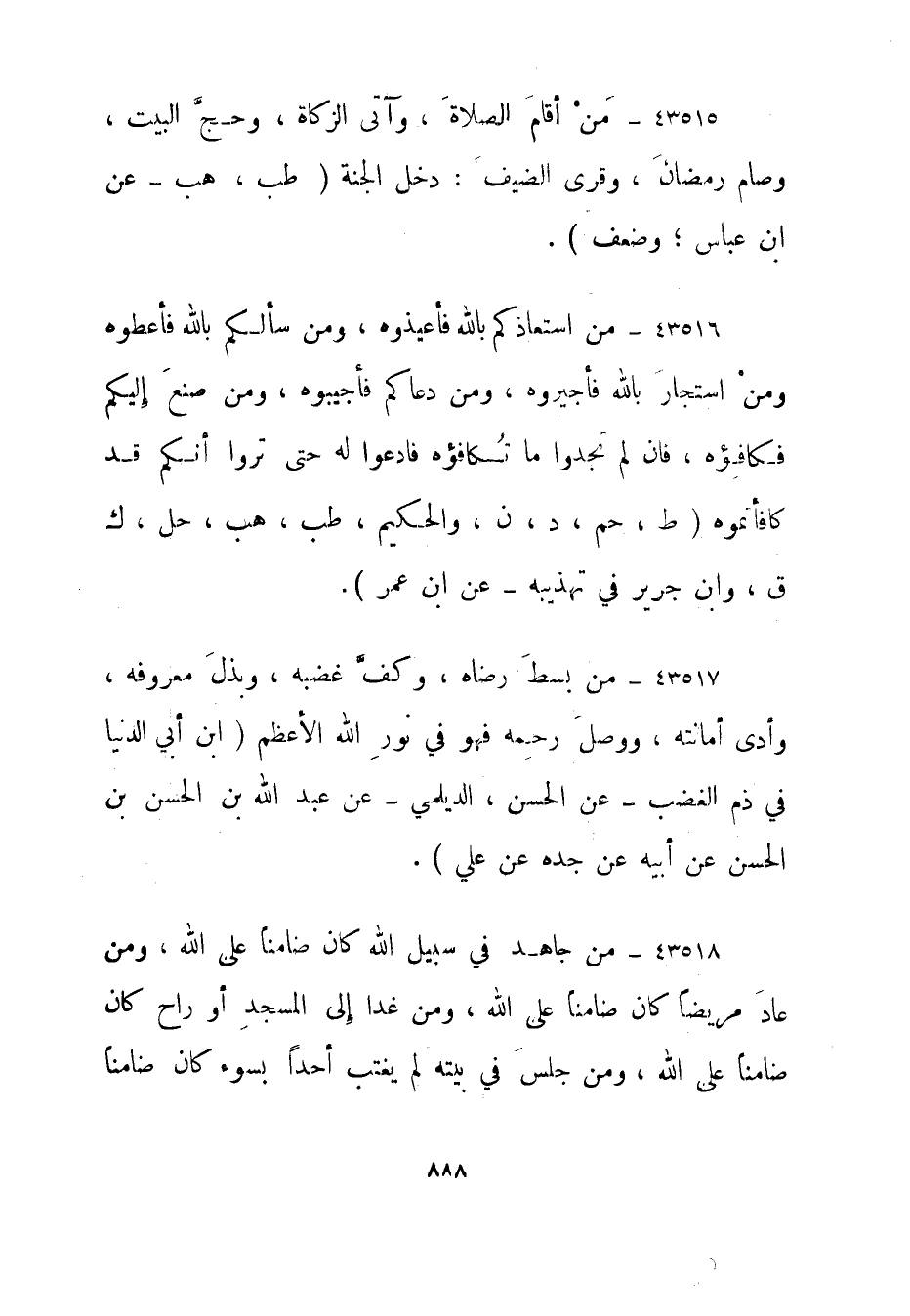 43515- من أقام الصلاة، وآتى الزكاة، وحج البيت، وصام رمضان، وقرى الضيف: دخل الجنة."طب، هب - عن ابن عباس؛ وضعف".